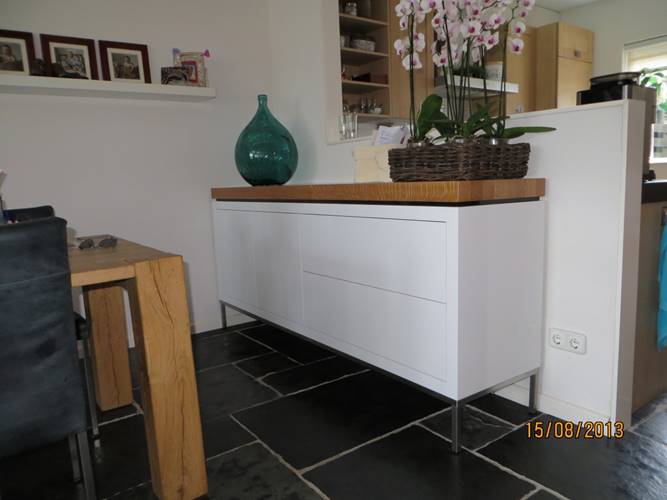 Vraag uw dressoir met houten blad aan! Denk daarbij aan afmeting (breedte/hoogte/diepte), RAL kleur, hoogglans/zijdeglans/mat