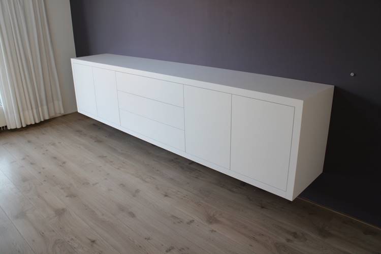 Uw zwevende dressoir? Denk daarbij aan afmeting (breedte/hoogte/diepte), RAL kleur, hoogglans/zijdeglans/mat en wel of geen houten blad